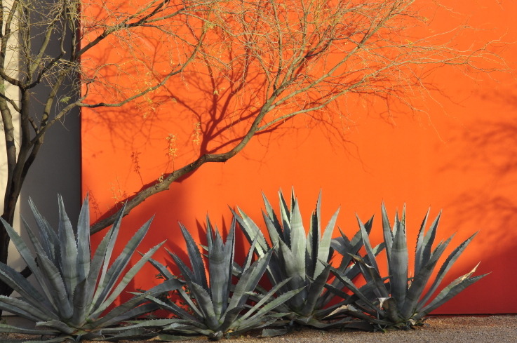 the juxtaposition of the lo-chromatic texture and hue of the plant against the fully saturated brilliant orange wall.