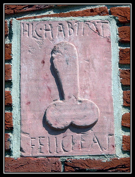 “Hic habitat felicitas”, Here lives happiness. An apotropaic relief of a phallus at a bakery in Pompeii..