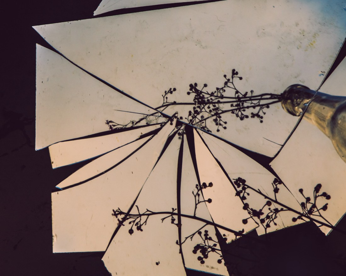 still life with broken mirror and wild flower