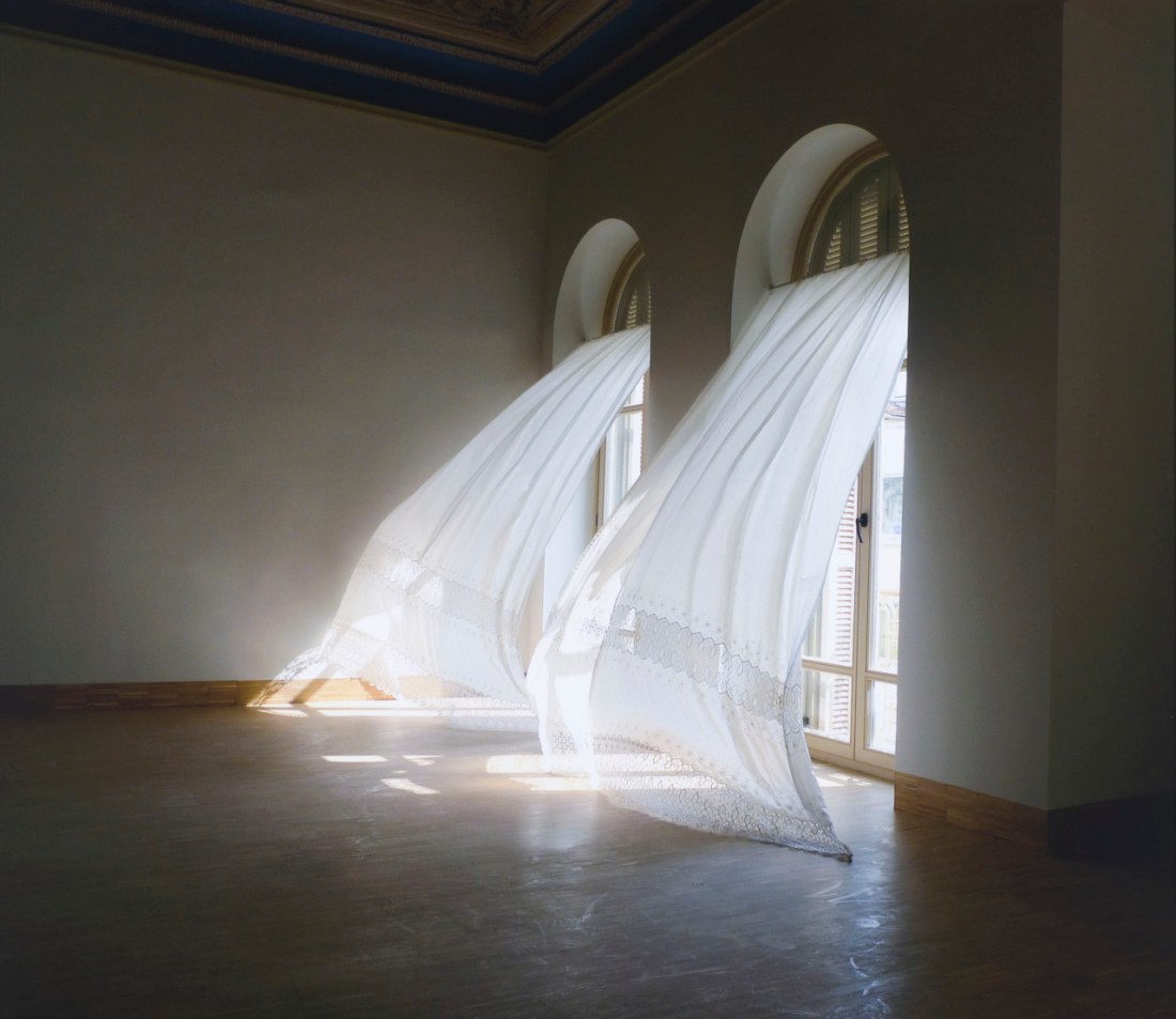 The title of the work is identical to a series of photographs by Huseyin shot in Odessa, showing curtains blowing in the wind. These images inspired an installation of hardened lace curtains, frozen in time and space. The work refers to the gesture of opening the windows to set free the soul of the deceased, as well as the idea of a spirit present in a room, mysteriously lifting the curtains to reveal its presence.